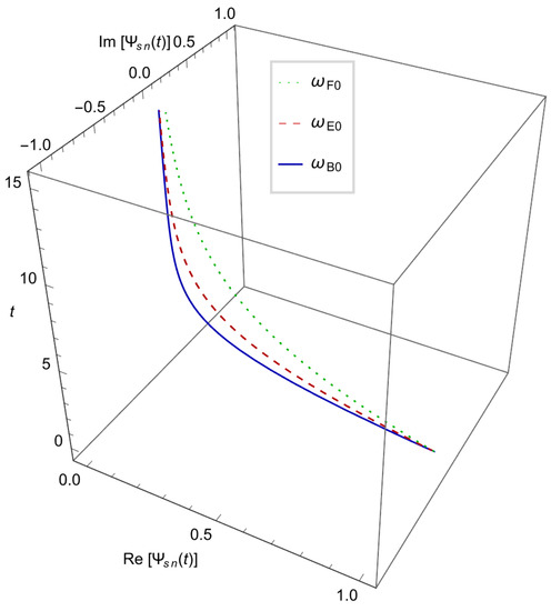 Finally, we can also discuss the time dependence of the wave eigenfunctions, , which is shown in Figure 3. From this plot, we can realize the “final flight” of the test particles when crossing into the 4DEGBBH exterior event horizon.