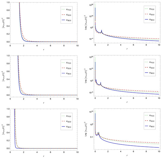(Top) panel: the squared full quasibound state radial wave eigenfunctions (left) and their log-scale plot (right) for . (Middle) panel: the squared full quasibound state radial wave eigenfunctions (left) and their log-scale plot (right) for . (Bottom) panel: the squared full quasibound state radial wave eigenfunctions (left) and their log-scale plot (right) for . We focus on the fundamental mode , and the units are in multiples of .