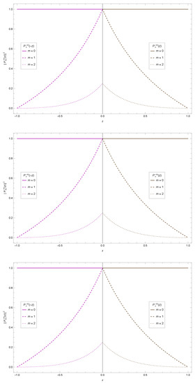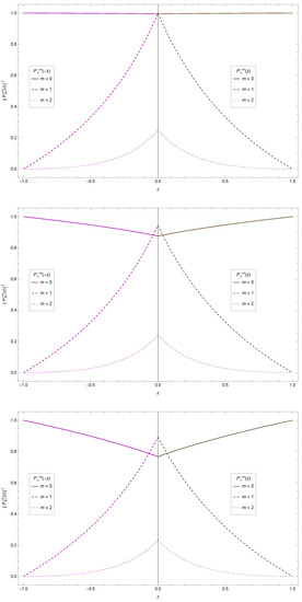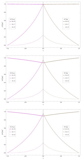 It is known that the angular solution must be regular at its two boundaries, namely, when and . This requirements single out a discrete set of angular eigenvalues , which couples the angular and radial equations. In our case, we can obtain the values for the angular eigenvalues by substituting the first polynomial condition, given by Equation (62), into the second polynomial condition, given by Equation (63). The ±signs denote the positive and negative solutions; Here, we choose the positive values, in order to express all the angular solutions in terms of the associated Legendre functions.