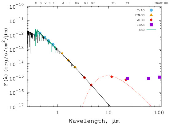 The SED of LkH 324/B was constructed in the ∼0.36–100 m range using the original CrAO photometry and flux-calibrated SSO low-resolution spectrum, as well as the archival data from the Two Micron All Sky Survey (2MASS, [42]), Wide Field Infrared Explorer (WISE, [43]), and Infrared Astronomical Satellite (IRAS, [44]) point source catalog. We fitted the observed SED by the grid of pre-computed theoretical fluxes for an appropriate range of values and stellar radii. Simultaneously, the interstellar extinction was also fitted using the Fitzpatrick et al. [45] extinction curve and the total-to-selective absorption ratio . As a result, we determined extinction mag, which is close enough to the value initially determined from DIBs.