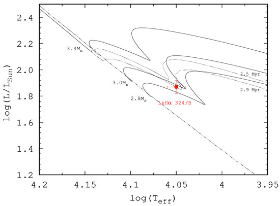 and plot LkH 324/B in the Hertzsprung–Russell (HR) diagram (Figure 2). A comparison with the theoretical evolutionary tracks and isochrones from the PARSEC grid [48] calculated for the metallicity reveals that LkH 324/B is a star with an age of Myr. It still lies above ZAMS on the PMS evolutionary track and recently passed the penultimate luminosity minimum caused by the rearrangement of the central structure after ignition of the first two proton capture reactions in the C→N chains of CNO cycle [49]. The star is now on the ascending part of the evolutionary track due to enhanced release of the gravitational energy. It is interesting to note that although LkH 324/B lies close (≲0.05 dex by ) to ZAMS on the (, L)-plane, it will take a non-negligible time to reach it. The star has so far completed only ∼78% of its entire 3.7-Myr PMS evolution.