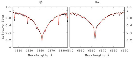 Atmospheric parameter determination was an iterative procedure for finding a model that yields the best match between synthetic spectrum and observations. As the starting parameters and , we used those of ∼A0– B9 stars obtained from the calibrations of the MKK system [34,50]. Then, within reasonable limits around these parameters, we have calculated the initial grid of helium-weak (Section 4.4) models with a hydrogen abundance of . The atmospheric model and the emergent flux were calculated with the LLmodels code [51], which employed line-by-line opacity treatment, and hence, allows to effectively account the specific opacity distribution in the chemically peculiar atmospheres. The corresponding synthetic spectra were calculated with these models using Synth3 code [52] and with the atomic data retrieved from the VALD3 database [53,54,55]. The iterative procedure also involved estimation the abundances of the few elements (e.g., He, Si, Fe, and Cr) mostly contributing to opacity, and hence, the temperature structure of the atmosphere. At each iteration, the atmospheric model and the emergent flux were recalculated, taking into account the current approximation of the chemical composition.