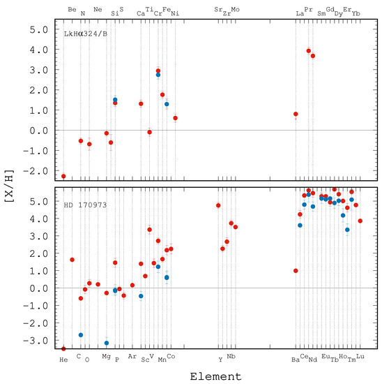 LTE abundances relative to the Sun in LkH 324/B (upper panel) and HD170973 (lower panel). Abundances deduced from different ionization stages of a given element are shown in different colors. For Ba in LkH 324/B, the upper limit of abundance is shown.