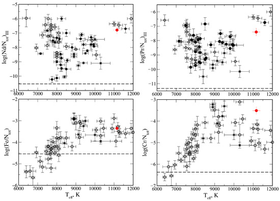 Dependence of Nd, Pr, Fe, and Cr abundances on the effective temperature in Ap stars on the main sequence according to Ryabchikova and Romanovskaya data [71]. LkH 324/B is shown using a red filled circle with error bars. Horizontal dash lines indicate solar abundance of a given element.