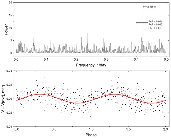 Frequency analysis of LkH 324/B photometric variability. Upper panel: Lomb–Scargle periodogram. Lower panel: phase curve folded with . Average brightness level was subtracted from the data. Solid red curve represents the sinusoidal fit of the data.