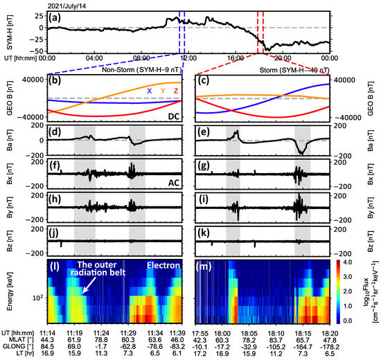 Figure 1. FY-3E observations in the auroral oval on 14 July 2021. (a) The SYM-H index. (b,c) DC magnetic fields in the GEO coordinates observed by the FY-3E/PKU-HMF instruments. (d,e) The deviations of the azimuthal component of the DC magnetic fields from the IGRF magnetic field model. (fk) The AC magnetic fields in the GEO coordinates obtained by the FY-3E/ACMag instruments. Auroral-oval waves can be observed. (l,m) The spin-averaged fluxes of energetic electrons observed by the FY-3E/BD-IES instruments.