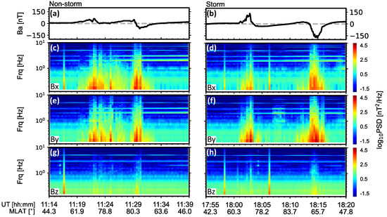 As shown in Figure 1d,e, both before and in the main phase, a Ba peak and valley are observed around the poleward boundary of the duskside and dawnside outer radiation belt (Figure 1i), respectively. These signatures represent the Birkeland field-aligned current (FAC) system [28,33]. Just within the FACs, waves are observed in the AC magnetic fields (Figure 1f–k). The waves are dominated by their transverse components, as the oscillations in the z component are much weaker than those in the x and y components. Furthermore, the waves are broadband. Figure 2 gives the dynamic spectra derived from a wFFT, with Figure 2a,b showing Ba again for reference. It is clear that all the spectra extend continuously from 0.1 Hz to 10 Hz, with the power decreasing as frequency increases. No local peaks can be identified clearly. Figure 2 also suggests a latitude-dependence of the waves. As they approach the center of the FACs, the power spectra increase in amplitude and become harder (i.e., extending to higher frequency), leading to a bell-like latitude profile. This latitude profile suggests that the waves contain more energy in the FAC center regions and thus could lead to stronger charged particle energization there. We note that the latitude extent in which the waves are significant is overlapped with the auroral oval, indicating these waves can be classified as the aforementioned auroral-oval waves.