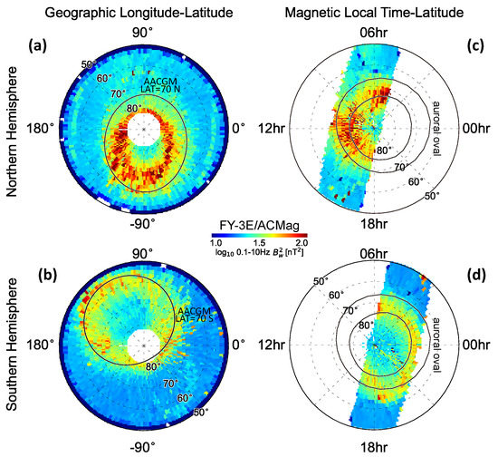 Figure 3. Morphology of the auroral-oval waves measured by the FY-3E/ACMag instruments, generated from data taken during the first two months of operation (10 July 2021 to 26 August 2021). (a,b) Geographic maps of average wave power in the northern and southern hemispheres, respectively. The solid curves are iso-latitude curves of the AACGM coordinates [34]. (c,d) Magnetic local time–latitude maps of average wave power in the northern and southern hemispheres, respectively. The solid curves represent the average location of the auroral oval given by [23]. (Strictly speaking, this model only describes the auroral oval in the northern hemisphere, whose location might slightly differ from that in the southern hemisphere [35]. However, since here only the general pattern is wanted, we also use it to represent the southern hemisphere’s auroral oval.)