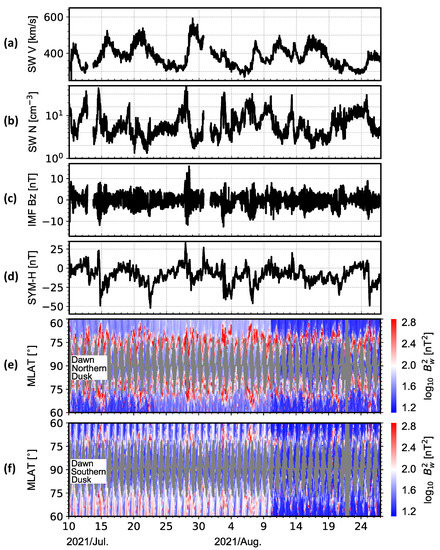 Figure 4. Overview of the response of the auroral-oval waves to the corotating interaction region-driven recurrent storms. Observations obtained from 10 July to 26 August are shown. (ac) The solar wind speed, solar wind proton number density, and GSM-z component of the interplanetary magnetic fields obtained by the WIND satellite. The short gaps in the data are due to missing data in the OMNI dataset. (d) The SYM-H index. (e,f) The integrated power (over 0.13–10 Hz) of the auroral-oval waves observed in the northern and southern hemisphere, respectively.