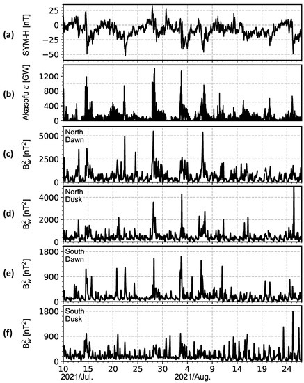 We first investigate the power of the auroral-oval waves. Figure 5a gives the SYM-H index for reference. Figure 5b shows the Akasofu ϵ parameter [39] representing the amount of energy transported from the solar wind into the magnetosphere (based on WIND observations). From top to bottom, the other four panels of Figure 5 show the maximum power in the northern dawnside hemisphere, northern duskside hemisphere, southern dawnside hemisphere, and southern duskside hemisphere. Again, Figure 5 indicates that the auroral-oval waves in the northern hemisphere are stronger than those in the southern hemisphere. For example, in the 14 July storm, the maximum power reached in the northern dawnside hemisphere is ∼3500 nT 2 , about 3 times larger than that in the southern dawnside hemisphere (∼1200 nT 2 ). Figure 5 also shows that the power at the dawnside is larger than that at the duskside. As an example, we note that the maximum power reached in the northern dawnside hemisphere is about 2 times larger than that reached in the northern duskside hemisphere (∼1600 nT 2 ) in the 14 July storm. Thus, combining the north–south and dawn–dusk asymmetry together, we have the following order: northern dawnside hemisphere > northern duskside hemisphere > souther dawnside hemisphere > souther duskside hemisphere.
