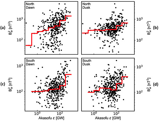 Figure 6. The relationship between the integrated power and the Akasofu ϵ parameter. (ad) Observations corresponding to the northern hemisphere dawnside, northern hemisphere duskside, southern hemisphere dawnside, and southern hemisphere duskside. The red curves represent the mean values of the power in each ϵ bin.