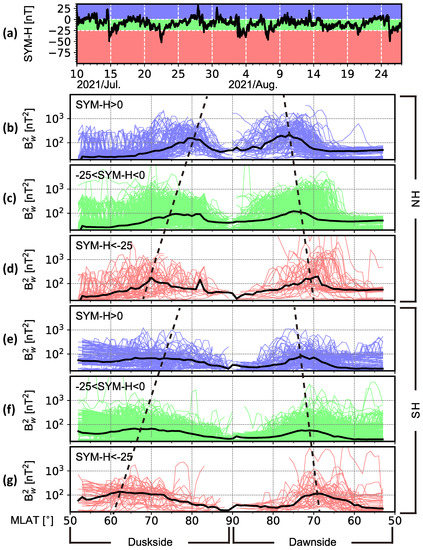 Figure 7. The latitude profiles of the integrated power of the auroral-oval waves. (a) The SYM-H index. (bc) Observations corresponding to SYM-H > 0 nT, −25 nT < SYM-H < 0 nT, and SYM-H < −25 nT. All observations shown here are obtained in the northern hemisphere. The left and right half of the panels correspond to duskside and dawnside observations, respectively. (eg) The same as panels b–c but using the southern hemisphere observations.