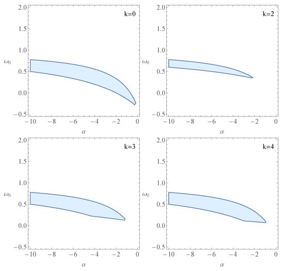 In Figure 1, we plot some examples of the stable regions of the homogeneous and inhomogeneous scalar perturbations. In this figure, the values of k are taken to be , and represents the homogeneous scalar perturbations. For the inhomogeneous scalar perturbations, the stable regions become larger and larger with the increase in the value of k. It is obvious that the smallest stability region is obtained in the case .