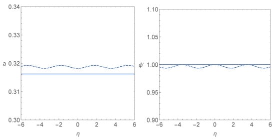 In Figure 2, the evolutionary curves of a and against are depicted. In this figure, the solid line represents that the initial value of a is the Einstein static solution , while the dashed line denotes that the initial value of a has a slight deviation of . When the initial value of a is chosen as the Einstein static solution , it can be seen that the evolutionary curves of a and parallel to the -axis. Considering a slight deviation of the initial value , the evolutionary curves of a and oscillate near the Einstein static state, which are depicted by the dashed line in Figure 2. These figures show that the Einstein static solutions are stable under the stability conditions (40).