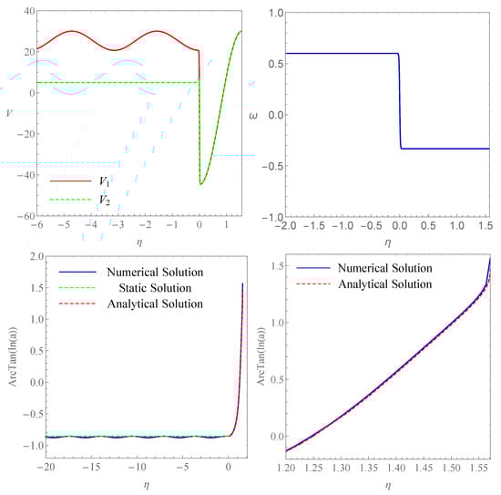 In order to realize the exit of the universe from the stable Einstein static state and evolve into the inflationary era, it is necessary to break the stability conditions of the Einstein static state. To achieve this goal, we need to construct a scalar potential V and an equation of state parameter to realize this transition. According to previous discussion, both V and are constants in the Einstein static state, while V has the form in Equation (43) and takes the value in the slow-roll inflationary era. So, we require that the scalar potential V and the equation of state parameter vary with the conformal time slowly, they approach to a constant in the Einstein static state and decrease rapidly when inflation begins . Considering these conditions, we construct a scalar potential