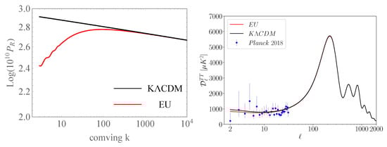 As shown in Figure 3, since the numerical and analytical solution of the Friedmann equations overlap, the evolution of scale factor a during inflation can be described by Equation (42) entirely. By considering the evolutionary form of the scale factor and solving the curved Mukhanov–Sasaki Equation (48), we obtain the analytical approximation for the primordial power spectrum in the emergent universe. Then, we depict the primordial power spectrum and CMB TT-spectrum in Figure 4 which shows the primordial power spectrum is suppressed at and CMB TT-spectrum is suppressed at .