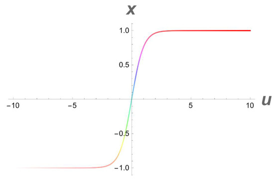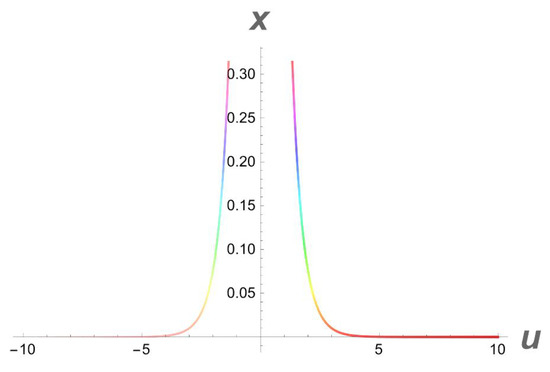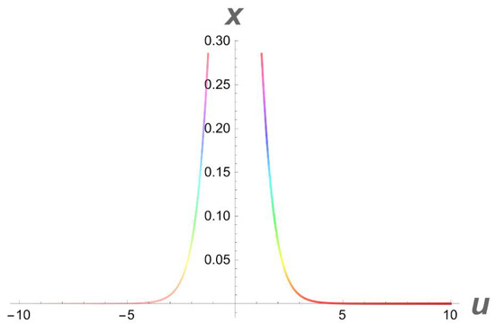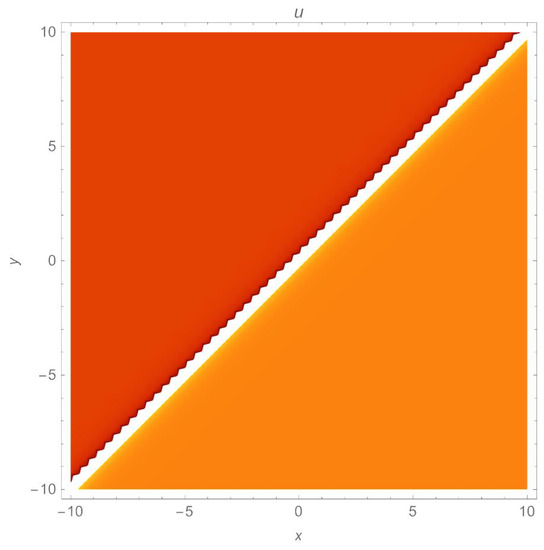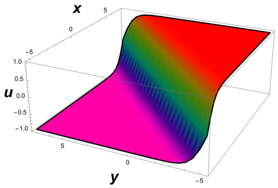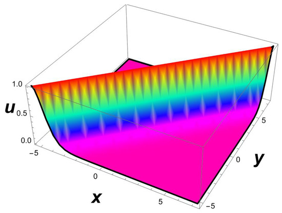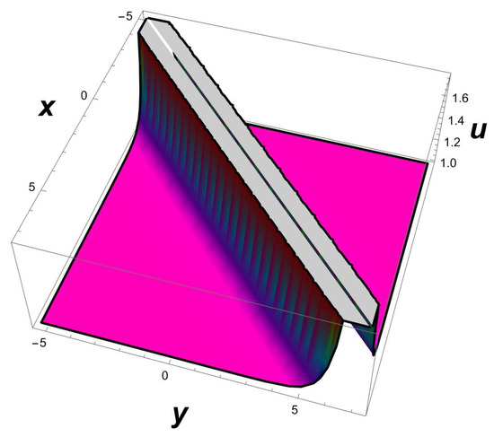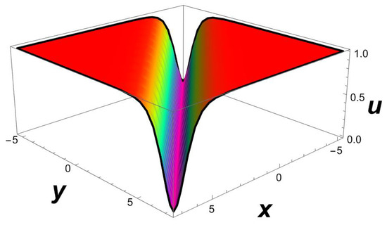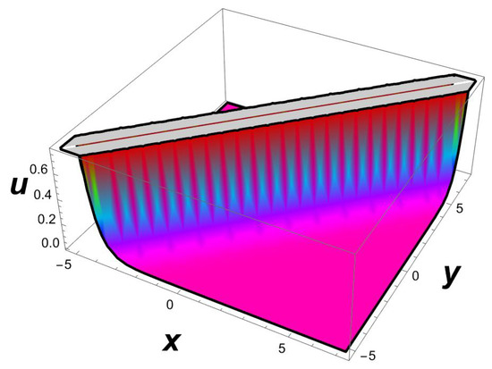 It should be noted that a (3+1)-dimensional Chaffe–Infante equation possesses a singular soliton solution (26) if the elements fulfill the requirements , , and , although the inverse widths and remain free parameters. This is the first time that this observation has been recorded. A graphical simulation of the travelling wave solution (26) is given in Figure 4, Figure 5 and Figure 6.