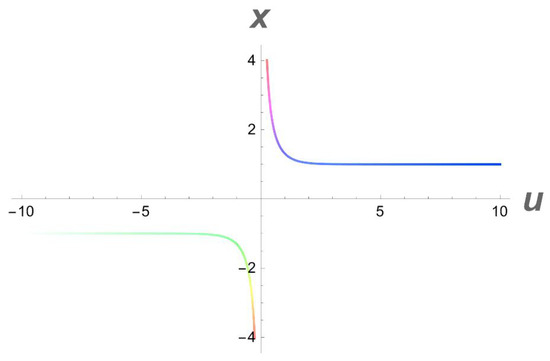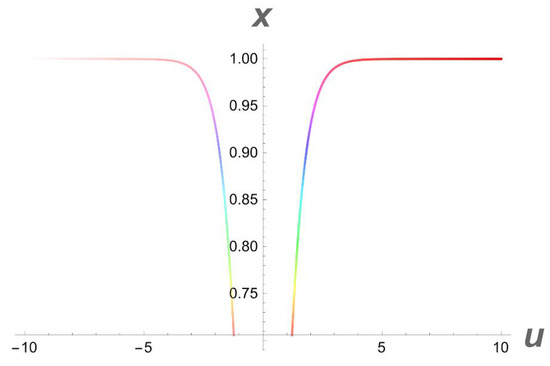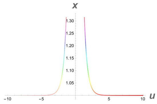 It is important to note that a generalized (3+1) Chaffee–Infante equation does accept singular soliton solutions, but only if certain conditions are satisfied, including , , , and , while the inverse widths remain free parameters. Moreover, we note that Equation (3) has a second singular soliton solution if , , , and , while the inverse widths are left as free parameters. It should also be pointed out that there are no other values of the power-law nonlinearity element n for which singular soliton solutions will exist with respect to the function. This is a very commendable observation that is reported for the first time here and the graphical simulations of (29) and (31) is given in Figure 7, Figure 8 and Figure 9 and Figure 10, Figure 11 and Figure 12, respectively.