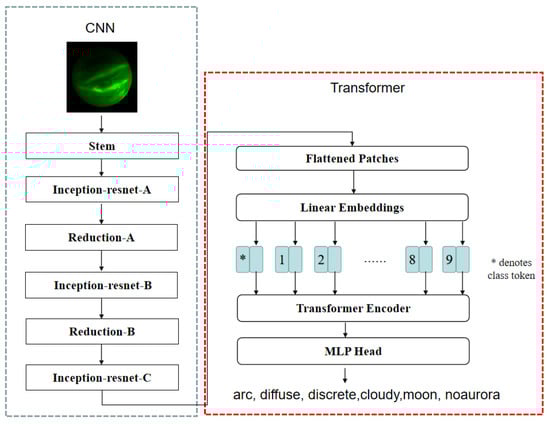 Bearing the above analysis in mind, we proposed a CNN–transformer model by introducing vision transformers, which are a type of novel deep learning model based on the CNN model [22] and the vision transformer [23] for auroral image classification. In the presented model, both the information in the local receptive field and the global receptive field of the images could be employed. In addition, the attention mechanism was supposed to unveil the global associations between the long-distance pixels in the auroral images. Furthermore, to evaluate the performance of the presented method, we conducted comparison experiments between the state-of-the-art algorithms and ours. The experimental results demonstrated that the proposed algorithm achieved superior performance over the competing techniques in terms of sensitivity, specificity, and accuracy. To compare with the other works in a fair fashion, we leveraged the original OATH dataset [1] with six classes of auroral images, including arc, diffuse, discrete, moon, cloudy, and no-aurora. Both the binary classification (aurora and no-aurora) and hexagonal classification (arc, diffuse, discrete, moon, cloudy, and no-aurora) were implemented by using the presented methods in the comparison experiments. In general, the contribution of this study includes: (1) This is an early work using a CNN–transformer model in automatic auroral image classification; (2) Both the local receptive field and global receptive field of auroral images can be utilized by the proposed model; (3) The proposed model achieved superior performance over the state-of-the-art algorithms.