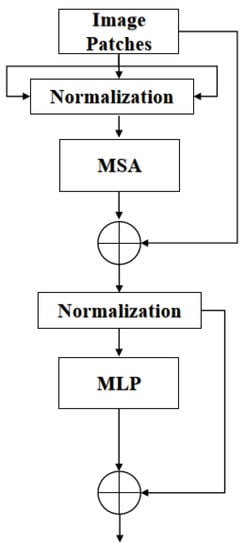 In addition, the transformer phase in the proposed framework introduced the vision transformer model [23]. The details of the transformer encoder in the presented transformer are provided in Figure 4.