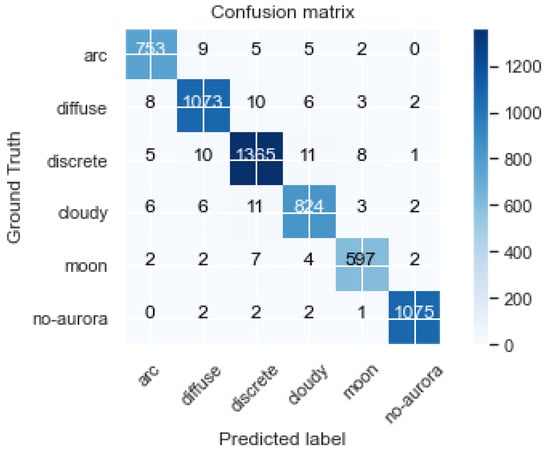Many traditional machine learning-based methods have been proposed to assist in the task of auroral image classification. Yet, the performance of the machine learning algorithms depends on manually crafted features and an appropriate classifier. For instance, in the early work in this area presented by Syrjäsuo and Pulkkinen [7], all-sky images collected by the Finnish Meteorological Institute were leveraged, and the authors developed a machine vision algorithm to classify the images using skeletons of the auroral morphology within a noisy environment. To research the near-Earth space, Syrjäsuo and Donovan [8] introduced a K-nearest neighbor (KNN) algorithm to implement aurora detection in an image and achieved an accuracy of around 90%. In 2011, Syrjäsuo and Partamies [6] detected the aurora’s existence, a fundamental task for auroral image analysis and processing. This study also represents an early work in auroral image classification with the moon present. To address four-class all-sky auroral image recognition, Yang et al. [9] employed the features of both spatial texture and a hidden Markov model (HMM). In this study, a set of uniform local binary patterns was used to represent the spatial structures of the images. In 2013, an auroral image classification approach was proposed by [10]. By incorporating linear discriminant analysis (LDA) and saliency information, the proposed method could provide semantic information within the auroral images. In addition, a support vector machine (SVM) was applied to perform auroral image classification. Rao et al. [11] proposed an approach for automatically classifying all-sky images into three categories, including aurora, none-aurora, and cloudy. A variety of features were extracted from the images and classified using SVM. The experimental outcome demonstrated that one specific type of scale-invariant feature transform (SIFT) feature achieved superior performance over the other types of features. Note that the above-mentioned machine learning-based classifiers have insufficient descriptive ability due to the employment of hand-crafted features, which might not be suitable for the requirements of auroral classification.