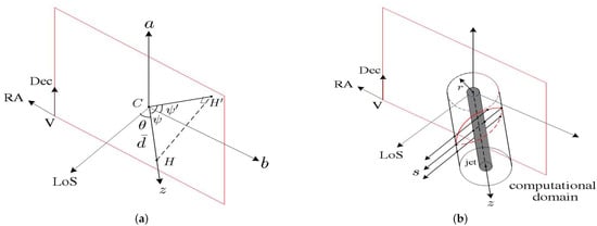 Figure 1b shows the computational domain, which is enclosed in a circular cylinder with the axis aligned to , and the jet is marked by a gray shade. The red contour marks the intersection of the computational domain boundary with a plane containing C that is perpendicular to RA. The synchrotron radiation from the jet is computed as an integration along a path s parallel to the LoS, starting from the farther intersection point with the red contour, and the result is projected onto the celestial sphere.