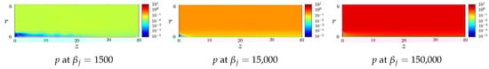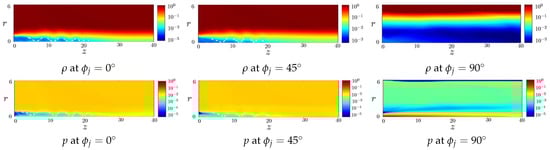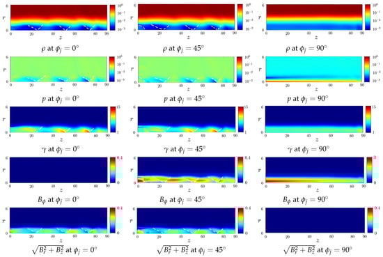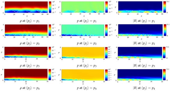 The PKS 1502+106 was observed to have a strong magnetic field, namely, [4]. Typical poynting-flux dominated jets satisfy and [3]. The magnetization of simulated overpressured magnetized jets lies in 0.5–17.5 [2,3,12]. In this work, we choose a benchmark case in the simulations with and , leading to . To investigate the effects of on the jet, the magnitude of the magnetic field is fixed and the averaged gas pressure is decremented by one order of magnitude at a time, down to , which is close to the gas pressure derived from the observed brightness temperature around the core.