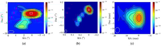 Table 2 lists the parameters associated with Figure 6 in [5,6]. The original beam was used to measure the brightness (Jy/beam), which is related to the intensity (erg/s/cm/sr/Hz), with the beam aperture of (sr), as [5,6,24].