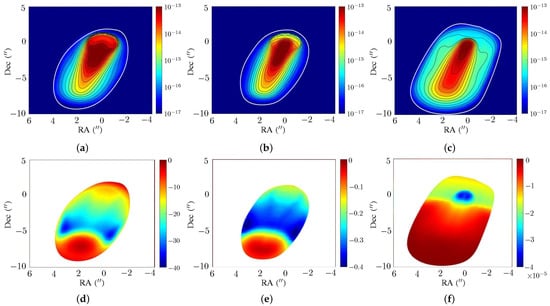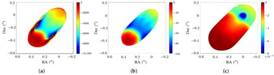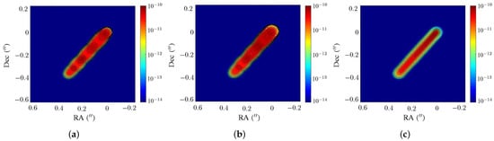 By comparing Figure 9 and Figure 11, the magnitude of the RM in scale a is about three orders smaller than their counterpart in scale b. The Faraday rotation is proportional to the electron number density n and the parallel component of the magnetic field, . The product of normalization factors and in scale a is about three orders of magnitude smaller than that in scale a, which explains the order difference of the RM in Figure 9 and Figure 11.