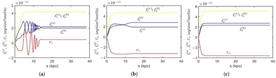 Figure 10b shows that in the HL2 model, the total intensity increases when (kpc), and slightly decreases and slightly increases when (kpc). Figure 10c shows that in the T2 model, , and their sum increase when (kpc), and remain almost unchanged beyond (kpc).