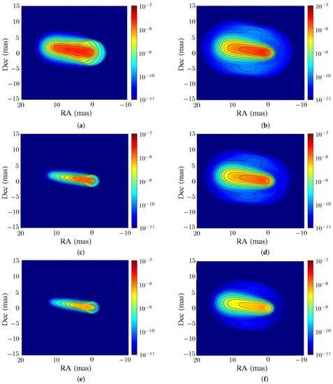 Figure 12c–f shows the intensity maps at and 15.4 GHz. The radiation features are similar to those at GHz. At higher observation frequency, the intensity map narrows down to the spine region and the magnitude of intensity decreases.