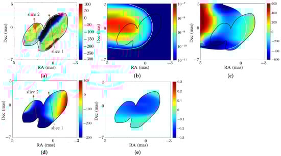 Figure 13d shows that the RM map in the observed region manifests a positive RM of about 50 (rad/m) in the west and decreases to (rad/m) towards the east. The RM oscillates along the traveling direction of the jet, manifesting a spine–sheath structure. The RM value changes from positive to negative along slice 1 across the core region; the RM value increases along slice 2 across the side region. Slices 1 and 2 reveal opposite RM gradients. The spine–sheath polarization structure, sign change in the RM slice and opposite RM gradients across the core and side regions are similar to the observation data.