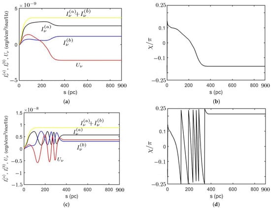 Figure 14b shows that the polarization angle decreases monotonically when , in which the magnetic field induces Faraday rotation. Figure 14c shows that the emitting region lies in the range , and the total intensity is almost unchanged beyond . The intensities and oscillate out of phase when . The effect of Faraday rotation increases when the frequency decreases because . Figure 14d shows the polarization angle oscillates drastically between and when , which is consistent with the oscillation of the Stokes parameters.
