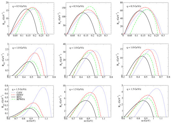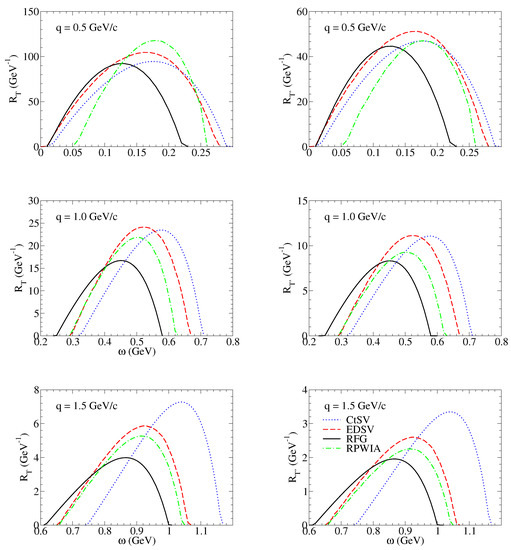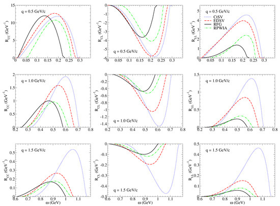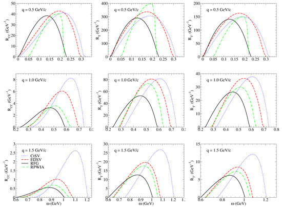 The previous discussion also applies to the two transverse responses (Figure 2), but with important singularities to be noted. First, the contribution of the longitudinal response in (anti)neutrino processes is, in most kinematicial situations, negligible compared with the transverse ones. Hence, the discrepancies observed in the T and channels between the predictions of the different models will emerge in the differential cross section. As observed, the CtSV model departs the most as q becomes larger. On the contrary, EDSV and RPWIA results get closer together, which is in accordance with the kinematics analyzed, where much larger values of the transferred energy and momentum (and also for the ejected nucleon momentum/energy) are involved. This implies that the strength of the potentials in the final state becomes weaker as q increases. Finally, compared to the RFG prediction, the EDSV responses (likewise RPWIA) are significantly larger (particularly in the T channel). This is in contrast to the results obtained for the pure electromagnetic transverse response [39], where the discrepancy between RFG and EDSV/RPWIA was much smaller. This can be connected with the axial–axial contribution in the weak responses that is absent in the electromagnetic interaction.