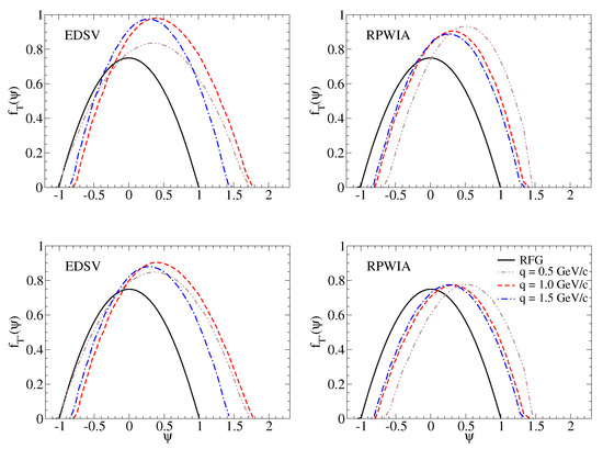 In Figure 5, we analyze the scaling of the first kind, i.e., independence of the scaling function with the momentum transfer, q. We have selected the EDSV and RPWIA models and show results only for C. In addition, for reference we present the RFG function (solid black line), i.e., . The left panels correspond to the EDSV approach, that is, results obtained in the presence of energy-dependent scalar and vector potentials in the initial and final states, while the right panels refer to RPWIA. We show separately the T (top panels) and (bottom panels) scaling functions comparing the predictions corresponding to three different values of the momentum transfer: q = 0.5 GeV/c (brown double-dotted dashed), 1 GeV/c (red dashed), and 1.5 GeV/c (blue dot-dashed).