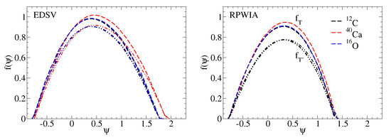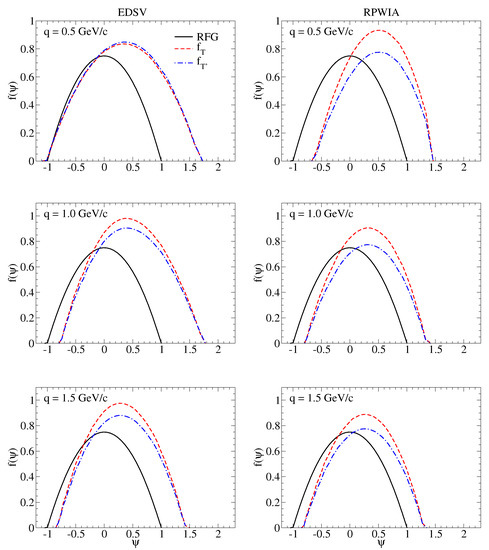 For completeness, we compare in Figure 7 and for the two models considered, EDSV and RPWIA, and three different values of the momentum transfer. The RFG prediction is also shown as a reference. Apart from the general shift to larger -values shown by EDSV and RPWIA, in what follows we restrict our attention to the basic differences between the predictions of the two approaches. As observed, the relative discrepancy between and is larger for RPWIA. In contrast, both scaling functions coincide for the EDSV model at GeV/c. Regarding the RFG, the EDSV and RPWIA scaling functions achieve their maxima at significantly higher values. Only for RPWIA at GeV/c and (right-bottom panel) is the maximum in the scaling function consistent with RFG. In all remaining cases, and particularly for the EDSV model, the and functions most likely exceed the RFG result. This makes an important difference with the electromagnetic function that is rather similar to the RFG one for the two EDSV and RPWIA models. In both cases, the electromagnetic scaling functions reach their maxima at , while the weak transverse responses get close to 1 in some cases, that is, higher. This particular result, which is not observed with the RMF model applied to finite nuclei [26,30], is probably connected with the assumptions of the RMF model applied to nuclear matter in addition to the specific role played by the axial term in the weak transverse responses.
