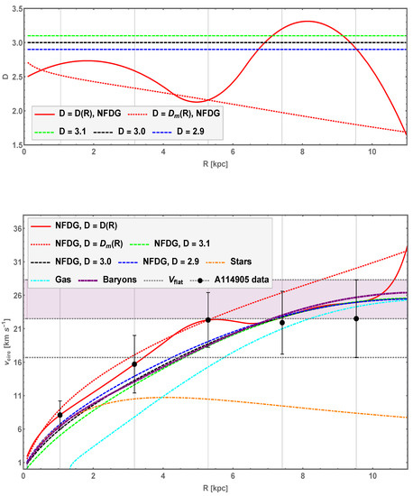 However, in our previous papers dealing with axially symmetric sources, we showed how the dynamics of stars orbiting in a disk galaxy depends on the galactic mass distribution, which might be better described by a fractal structure, and thus by an effective NFDG dimension , also depending on position. This is the main NFDG hypothesis, supported by how the galactic rotation curves can be effectively described by NFDG methods [2,3,8]. The three situations analyzed in this manuscript are meant to provide additional support for this hypothesis. In the following, we will first apply NFDG to the case of AGC 114905.
