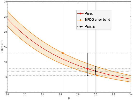 Figure 3 provides a more graphical illustration of our argument. In this figure, we show the dependence of the NFDG velocity dispersion as a function of the variable dimension D, following Equation (8) and the procedure described above. In particular, the stellar velocity dispersion is shown by the black data point corresponding to a standard spatial dimension and by the horizontal black-dashed line, while the globular-cluster velocity dispersion is shown by the red/orange data points (central value/error points, respectively, as also shown with horizontal gray-dotted lines), corresponding to the values of D reported in Equation (9): (red data point), (orange error data points).