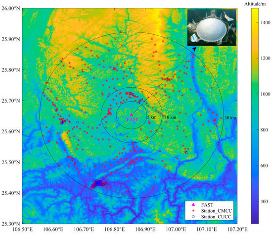 The location of FAST is situated in Kedu Town, Dawodang, within Pingtang County, located in the Guizhou Province of China (106.85° E, 25.64° N). With its natural geographic advantages and the unique structure designed by Chinese scientists, it is currently the world’s largest and most sensitive single-dish radio telescope and a major scientific and technological infrastructure project of China’s Eleventh Five-Year Plan. The scientific objectives of FAST mainly include: observing neutral hydrogen in the universe, searching for new pulsars, measuring very long baseline interference (VLBI), and extending deep space communication capabilities [13]. The FAST receiving and terminal systems currently include seven sets of receivers involving 70 MHz–3 GHz [14]. As shown in Figure 1, the IMT-2000 base stations around FAST include two operators, such as China Mobile Communications Corporation (CMCC) and China Unicom Communications Corporation (CUCC), mainly distributed within a range of 5–30 km from FAST, as radio equipment is prohibited in the core area of RQZ.