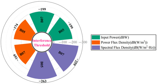 According to the interference protection requirements for FAST and Recommendation ITU-R RA.769 [15], IMT-2000 base stations mainly involve two types of receivers in FAST, namely, B05 and B07. The operating frequency range of the B05 receiver is 1100–1900 MHz, and the system noise temperature is 20 K, while the operating frequency range of the B07 receiver is 2000–3000 MHz, and the system noise temperature is also 20 K. The relevant interference threshold values are shown in Figure 2. Furthermore, in the FAST-IMT interference analysis, we are particularly concerned with the maximum input power that the FAST can tolerate, and the B05 and B07 receiver protection power thresholds are both −199 dBW.