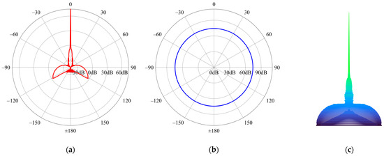 The typical radiation pattern of the FAST antenna at 1905 MHz: (a) 2D-vertical direction (zenith angle is 0°); (b) 2D-horizontal direction (elevation angle is 0°); (c) 3D.