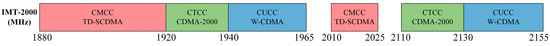 The IMT-2000 system was formally proposed by ITU in 2000, which extends the 2G communication system from narrowband to broadband. The IMT-2000 system is mainly committed to mobile internet technology, which fully integrates wireless communication and other communication technologies, such as the Internet. It operates in the 2000 MHz frequency band, with an uplink frequency band of 1890–2030 MHz and a downlink frequency band of 2110–2250 MHz, abbreviated as IMT-2000. The IMT-2000 system mainly adopts Code Division Multiple Access (CDMA) as its core technology and has now formed three mainstream technology standards, including wideband W-CDMA, CDMA-2000, TD-SCDMA, and others. The emergence of the IMT-2000 system has made mobile communication services capable of multimedia transmission, better transmission quality, and higher spectral efficiency [16].