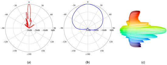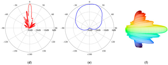 The typical radiation pattern of the base station antenna at 1700–2200 MHz and 1880–2700 MHz: (a) 2D-vertical direction (1700–2200 MHz); (b) 2D-horizontal direction (1700–2200 MHz); (c) 3D (1700–2200 MHz); (d) 2D-vertical direction (1880–2700 MHz); (e) 2D-horizontal direction (1880–2700 MHz); (f) 3D (1880–2700 MHz).