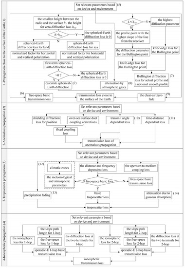 - Sub-model 4—Ionospheric propagation: for long-haul and low-frequency predictive links, it is essential to consider the ionospheric scattering transmission loss caused by sporadic-E, mainly including the one-hop propagation mode and two-hop propagation mode.
