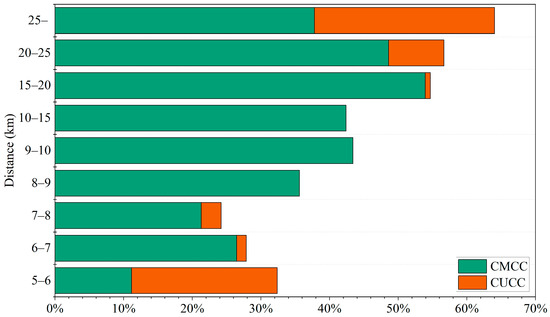 Based on the above parameters, we analyzed the interference situation of IMT-2000 mobile base stations, with a total of 62,415 data analyzed, of which 34,521 data meet the requirements, accounting for 55.31%. The evaluation results are classified and counted according to nine distance ranges of 5–6 km, 6–7 km, 7‒8 km, 8‒9 km, 9‒10 km, 10‒15 km, 15–20 km, 20–25 km, and over 25 km, as shown in Figure 7 (Note: there are no IMT-2000 base stations of CTCC near the FAST). The results show that: under the current conditions, the proportion of data meeting the FAST threshold requirements for base stations within a distance range of over 25 km is the highest, accounting for 64.03%, while the proportion for the 7–8 km range is the lowest, accounting for only 24.21%. Meanwhile, Table 1 provides the statistical proportion of data that meets the requirements for different receivers of FAST involved in the IMT-2000 frequency band. In the IMT-2000 frequency band, the operating frequency of the communication base station of CUCC is above 2100 MHz, which does not involve the B05 (1100–1900 MHz) receiver. Within the frequency band of the B05 receiver, the analysis data of IMT-2000 base stations meet the FAST protection requirements, accounting for 55.06%. The percentage is 56.00% in the B07 receiver frequency band.