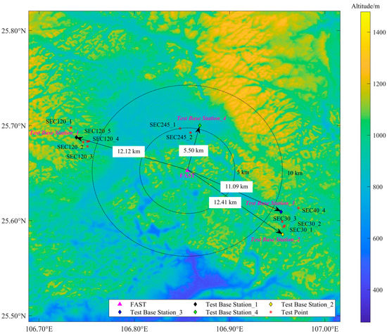 Four IMT-2000 base stations, including test base stations 1, 2, 3, and 4, were selected at different directions and distances around FAST. These base stations were operated by different operators and served as test sites. Then, multiple receiving points were set up in different sectors. In order to ensure the accuracy of the test results and avoid interference from terrain, buildings, high-voltage power lines, and other factors, the receiving antenna should be located in flat and open areas. The relationship between the test station and the various receiving test points, as well as the installation of the transmitting and receiving equipment, are shown in Figure 8; the notation “SEC120_1” in the figure refers to the first selected receiving point in sector 120 of the base station, and so on. The specific parameters of the field test are shown in Table 2.
