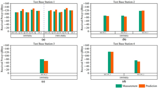 The comparative analysis and statistics between the measurement and prediction: (a) Test base station-1; (b) Test base station-2; (c) Test base station-3; (d) Test base station-4.