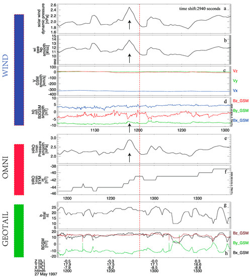 On 27 May 1997, a positive solar wind dynamic pressure pulse (from 2 to 2.5 nPa) induced by an elevation in solar wind density was observed by WIND satellite at 1151 universal time (UT), as shown in Figure 1a–c, indicated by the arrows. The satellite was positioned within the solar wind at GSM coordinates (147.1, 18.0, 6.5) Re, and concurrently observed the three Interplanetary Magnetic Field (IMF) components given in Figure 1d. The IMF exhibited distinct alterations correlated with the solar wind discontinuity accompanying the positive dynamic pressure pulse. The near-Earth solar wind dynamic pressure and SYM-H index from the OMNI data show similar impulses with the WIND observations at 1240 UT as presented in Figure 1e,f, which indicated the arrival of the positive solar wind dynamic pressure pulse at the magnetosphere. It is worth noting that there is a time delay between the solar wind dynamic pressure in the OMNI data and the SYM-H index. As the OMNI data only shift solar wind data to the bow shock nose, the signals still require some time to propagate to the magnetosphere.