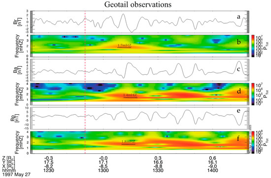 Geotail observations measured the three components of magnetic field variations in field-aligned coordinates, utilizing a non-stationary filtering technique. Radial component of the magnetic field is correspondent to poloidal mode waves, and azimuthal component of the magnetic field is related to toroidal mode waves. Wavelet power spectra of three components of magnetic field in field-aligned coordinate are presented in (b,d,f) column, in which the solid black lines are the frequencies with maximum power (a,c,e).