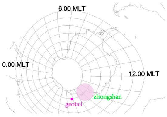 The magnetic foot point of Geotail spacecraft in the southern hemisphere. The magenta solid circle represents the field view of the ZHS all sky imager.